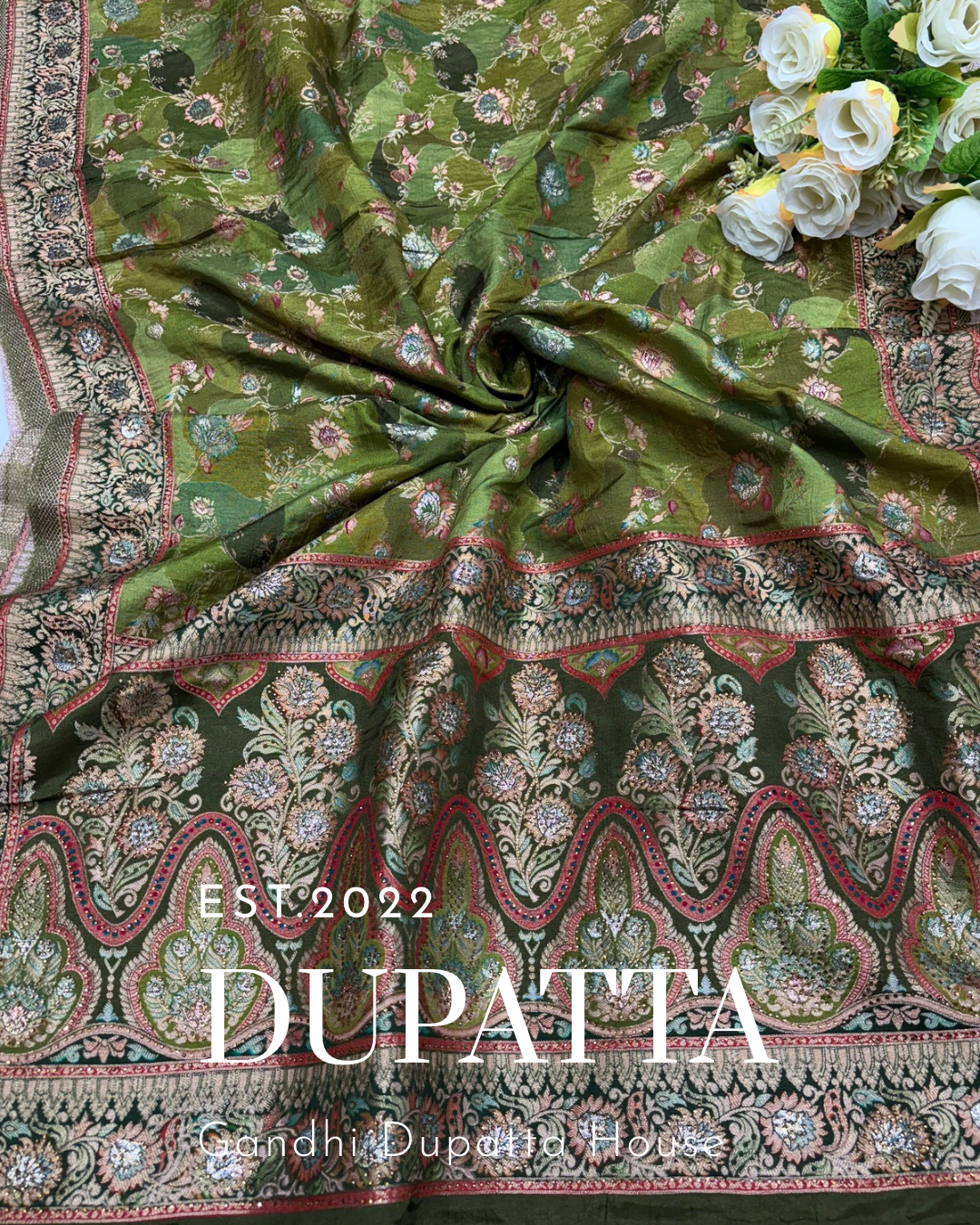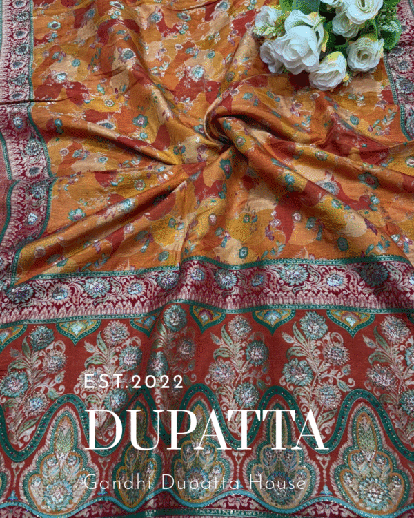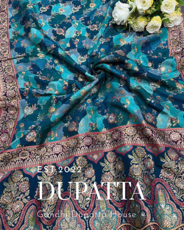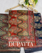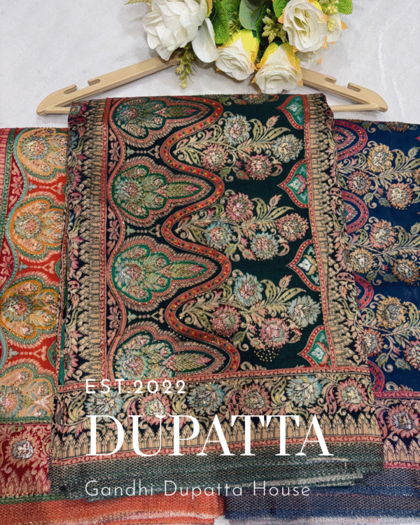 Crafted from premium Dola silk, this dupatta showcases intricate zari position work placed strategically to highlight its luxurious appeal. The soft, flowy fabric drapes beautifully, while the shimmering zari motifs add a touch of regal charm. Perfect for pairing with lehengas, suits, or sarees, this dupatta effortlessly blends tradition with elegance, making it an ideal choice for festive occasions and weddings.