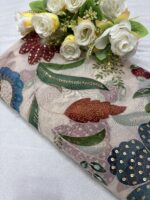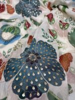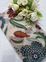 This exquisite fabric is crafted on premium organza, known for its sheer, lightweight, and elegant texture. The fabric is adorned with intricate heavy floral embroidery combined with delicate printed detailing, creating a perfect blend of modern charm and traditional artistry.