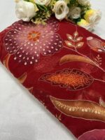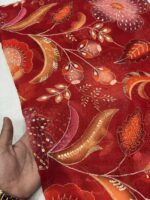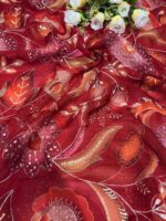 This exquisite fabric is crafted on premium organza, known for its sheer, lightweight, and elegant texture. The fabric is adorned with intricate heavy floral embroidery combined with delicate printed detailing, creating a perfect blend of modern charm and traditional artistry.
