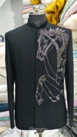 This elegant black Jodhpuri suit is crafted from premium-quality fabric, offering a perfect balance of structure, comfort, and luxury. Common base fabrics include: